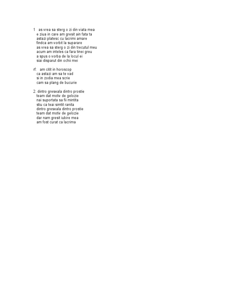 C am sa plang de bucurie dintr o greseala dintr o prostie ti am dat motiv de gelozie n ai suportat sa fi mintita stiu ca te ai simtit mintita dintr o greseala dintr o prostie ti am dat motiv de gelozie dar n am gresit. As vrea sa sterg o zi din viata mea e ziua in care am gresit in fata ta astazi platesc cu lacrimi amare fiindca am vorbit la suparare. Am citit in horoscop a song by nicolae guta on spotify. Am citit in horoscop ca astazi am sa te vad.