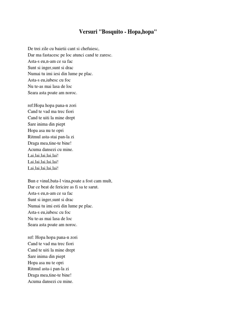 Bosquito hopa hopa versuri. Listen to official albums more. Doi ochi plecati se alearga si rar se intalnesc birou aceeasi banca asta toti o retraiesc asa mi petrec iubirile tu tinerete sa nu treci. De trei zile cu băieții cânt și chefuiesc dar mă fâstâcesc pe loc atunci când te zaresc ăsta s eu n am ce să fac sunt și înger sunt și drac numai tu îmi ești din lume pe plac. Hopa hopa până n zori când te văd mă trec fiori când te uiți la mine drept sare inima din piept hopa așa nu te opri în ritmul ăsta stai pân la zi draga mea ține te bine acuma dansezi cu mine bun e vinul bată l vina poate a fost cam mult dar ce beat de fericire aș fi să te sărut mai multe versuri din acest artist.