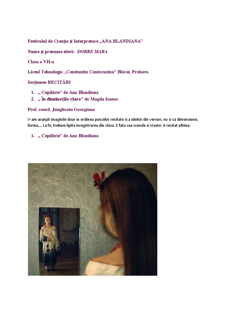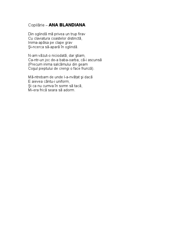 Copilarie de ana blandiana. In cazul in care nu gasiti referatul comentariu literar ana blandiana copilarie va rugam sa efectuati o cautare dupa un singur cuvant cheie. Ana blandiana n a scris in cariera sa de poeta decit putine piese care sa nu fi devenit imediat slagare. Precum inima salcâmului din geam. Un comentariu alexandra pe 6 noiembrie 2010 2 00 pm.