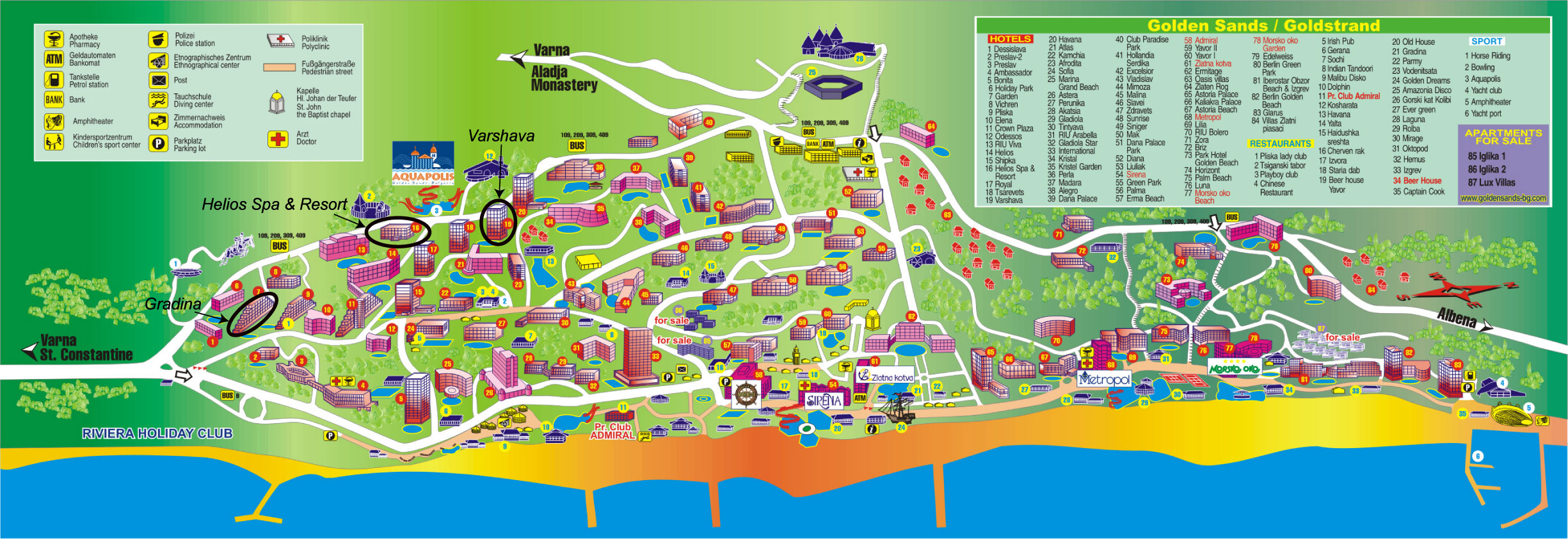 Nisipurile de aur este o staţiune litorală de pe coasta mării negre din bulgaria lăngă parcul naţional varna zonă protejată situat la 17 km nord de centrul orasului varna este practic legat de oras printr o serie continuă de staţiuni şi comunităţi rezidenţiale. Harta nisipurile de aur harta nisipurile de aur bulgaria harta statiune nisipurile de aur harta rutiera nisipurile de aur harta hoteluri nisipurile de aur map nisipurile de aur harta statiunii nisipurile de aur pozitie hoteluri vile si restaurante nisipurile de aur harta nisipurile de aur. Pe harta puteti localiza cu usurinta hotelurile disponibile din apropierea unui obiectiv turistic din nisipurile de aur si hotelurile ce sunt aproape de plaja. Bulgaria 2020 travel planner.