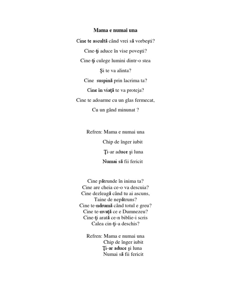 Cine pătrunde în inima ta. Cine te nvață ce e dumnezeu. Mama e numai una. Cine dezleagă când tu ai ascuns taine de nepătruns.