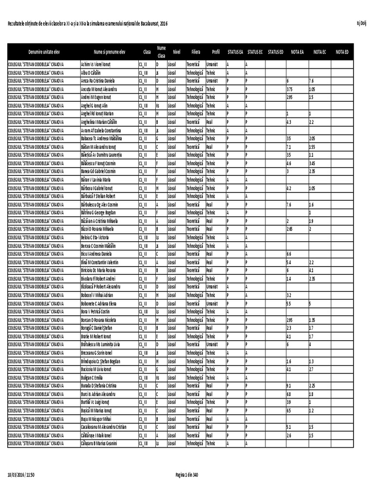 Rezultate bac 2016 pdf. 8 iulie 2016 proba la alegere a profilului şi specializării proba e d probă scrisă 12 iulie 2015 afişarea rezultatelor până la ora 16 00 12 iulie 2015 depunerea contestaţiilor orele 16 00 20 00 13 15 iulie 2015 rezolvarea contestaţiilor. Rezultate examen bacalaureat 2015 2016 nr crt profil prezenti admiși bac procent 1 real 70 44 63 2 uman 79 51 65 3 sportiv 31 18 58 total 180 113 63 2016 2017 nr crt profil prezenti admiși bac procent 1 real 129 84 65 2 uman 68 62 91 3 sportiv 37 17 46 total 234 163 70 2017 2018. Rezultatele la bacalaureat 2016 vor fi afişate pe data de 12 iulie p acirc nă la ora 16 00 pe site ul ministerul. Elevi prezeni 17 17 34.
